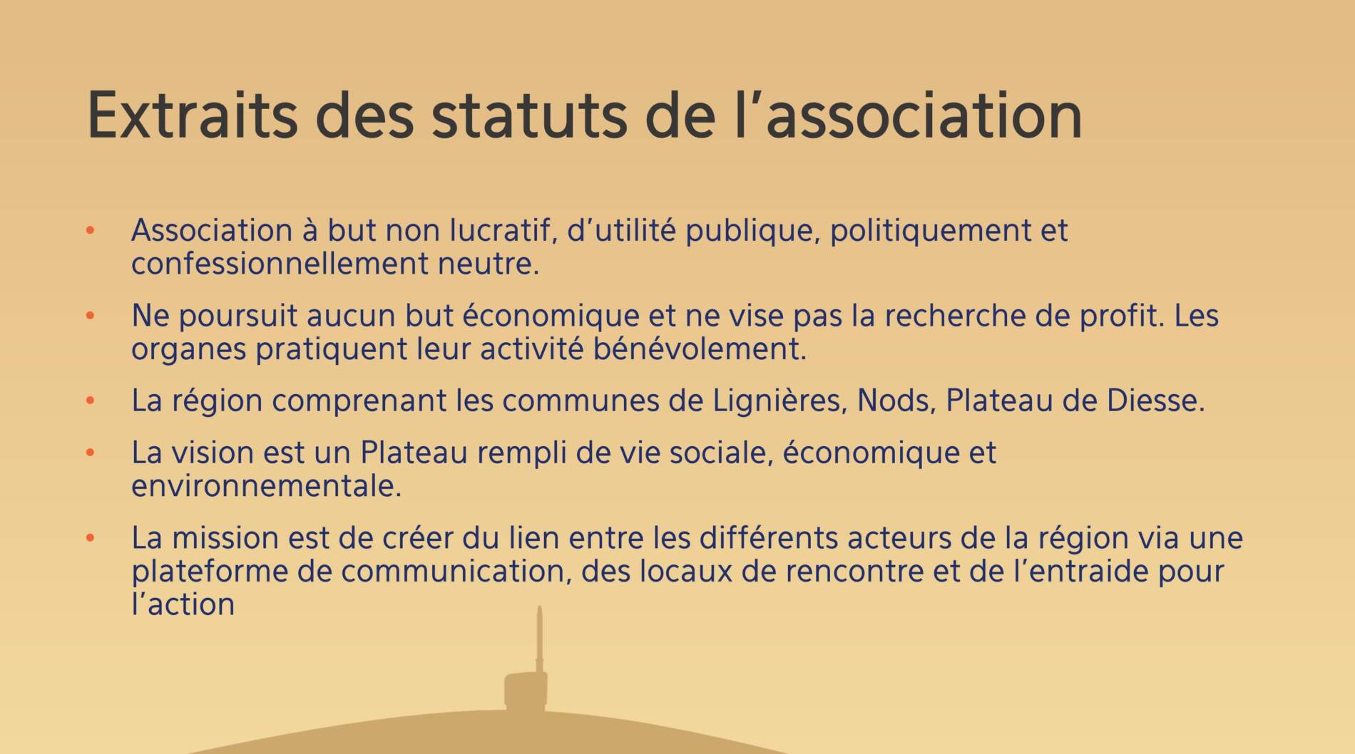 - Local – valoriser les ressources et talents du Plateau, se soutenir et prospérer ensemble. Pour le développement de la vie sociale, culturelle, économique et environnementale des trois communes du Plateau (Lignières, Nods et Plateau de Diesse)